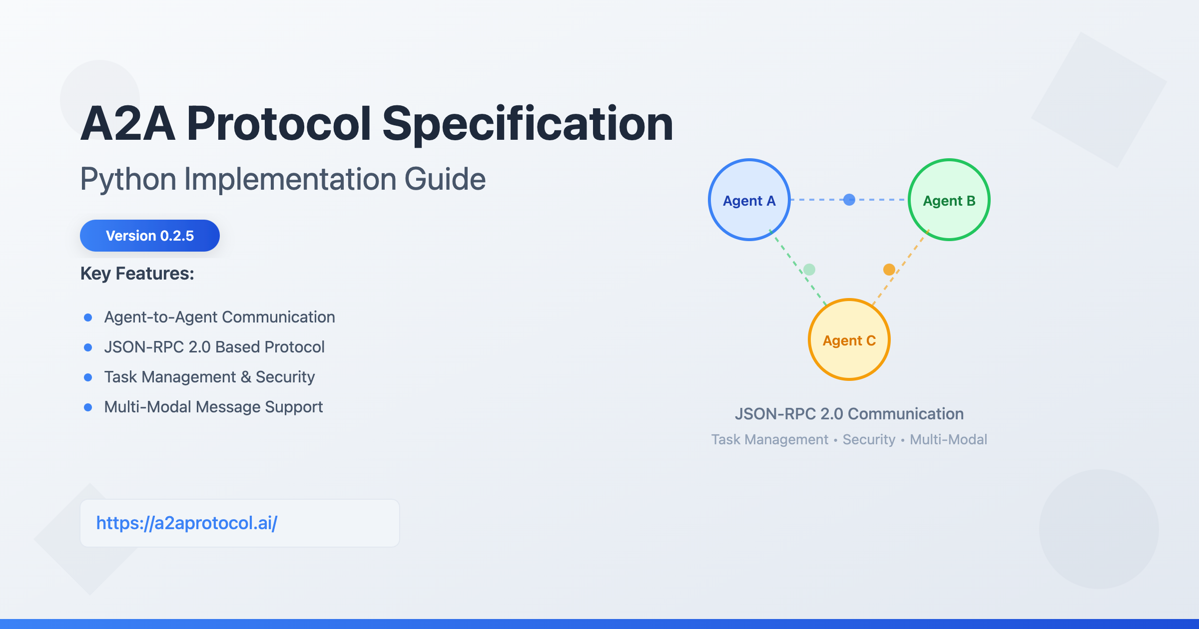 Das A2A A2A Protocoltokoll ist ein auf JSON-RPC 2.0 basierendes Kommunikationsprotokoll, das für die Interaktion zwischen intelligenten Agenten entwickelt wurde. Dieses Protokoll definiert Kernfunktionalitäten einschließlich Agentenfähigkeitsdeklaration, Nachrichtenübertragung, Aufgabenverwaltung und Sicherheitsauthentifizierung.